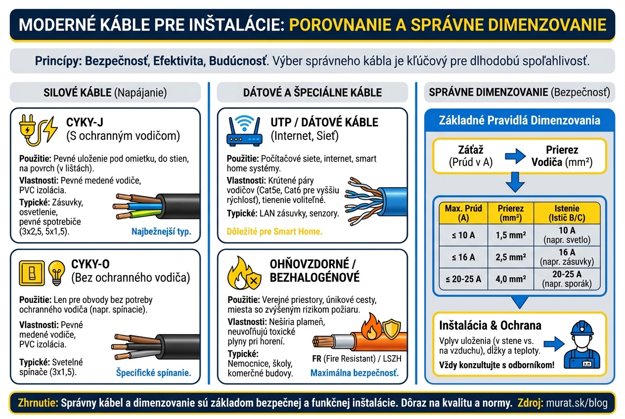 Najuniverzálnejším riešením ostáva CYKY kábel. Dôvod je jasný – zvládne zamurovanie, uloženie do káblového žľabu a taktiež aj do zeme. Ak potrebujete riešiť obmedzený priestor v úzkch drážkach alebo rekonštruujete rozvody v paneloch, siahnite po CYYPL (známy aj ako CYKYLo). Vďaka svojmu plochému profilu šetrí omietku, no pozor na to, že vyžaduje dodatočnú ochranu proti mechanickému poškodeniu. Viac o CYKY kábloch a ich označení sme písali v nedávnom článku v našom blogu.